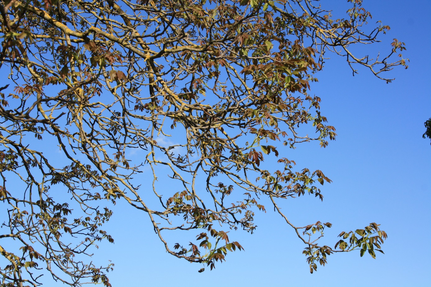 As one of the last local broad-leaved trees the walnut opens her sheets and then shows her insignificant female blooms. The wind carries the pollen of the male flower kittens. Here on the Moselle the walnuts mature possibly at the same time with the Riesling in October.